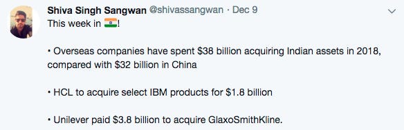 That overturns a long-term trend — the value of inbound mergers and acquisitions in China had outstripped that in India since at least 2000.